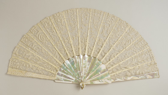 Machine lace on silk tulle leaf, mother-of-pearl sticks and guards, gold metallic loop, mother of pearl button