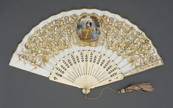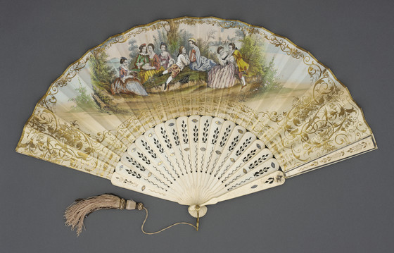 Paper leaf, bone sticks, gilded brass metallic loop, brass metallic button and rivet, silk tassel