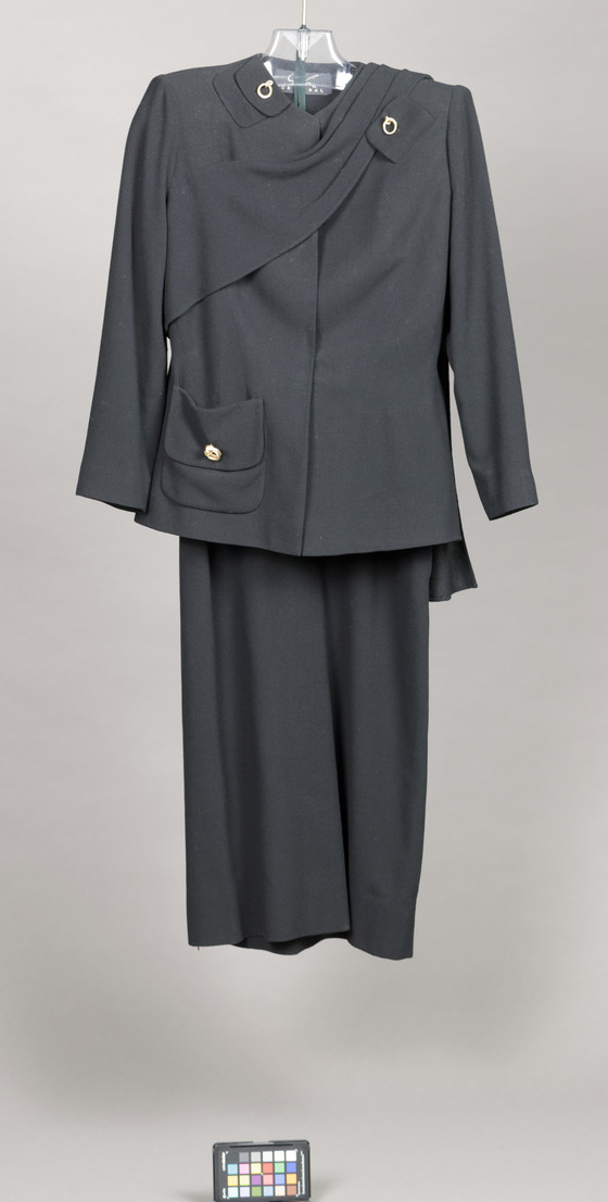 Jacket: wool plain weave (crepe) with metal ornaments; Skirt: wool plain weave (crepe)