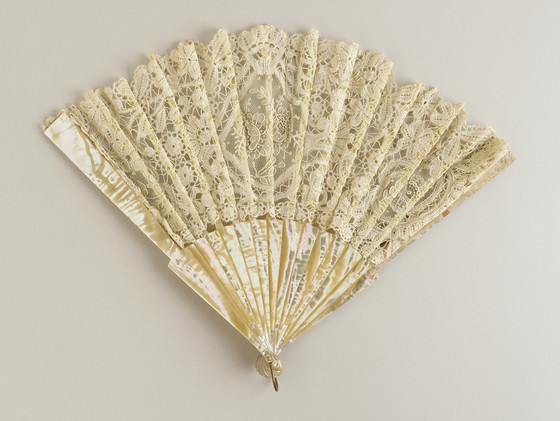 Brussels lace leaf, mother-of-pearl sticks and rivet end, brass metallic loop