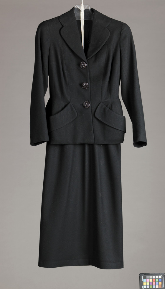 Jacket: Wool twill, fulled, resin buttons; Skirt: Wool twill, fulled.