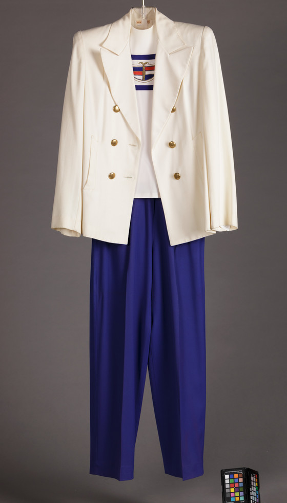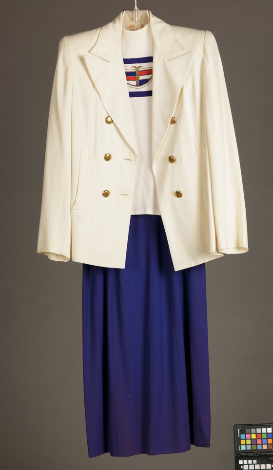 Jacket: Wool twill (gabardine), metal buttons; Blouse: Rayon plain weave (crepe), with metallic thread embroidery; Skirt and Pants: Wool twill (gabardine); Belts: Wool twill, metal.