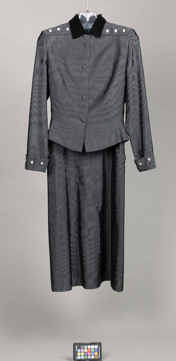 Jacket: Silk/wool faille (moiré), silk velvet, crystal buttons