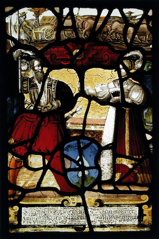 Pot metal; white glass with silver stain and enamel; flashed glass, abraded