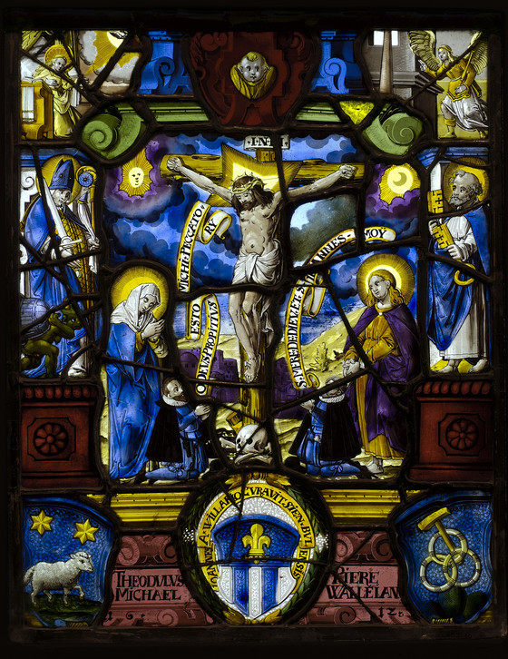 Pot metal; white glass with silver stain and enamel; flashed and abraded glass
