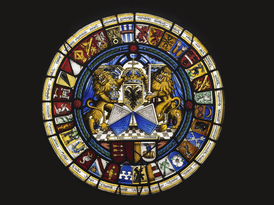 Pot metal; white glass with silver stain and enamel; flashed and abraded glass