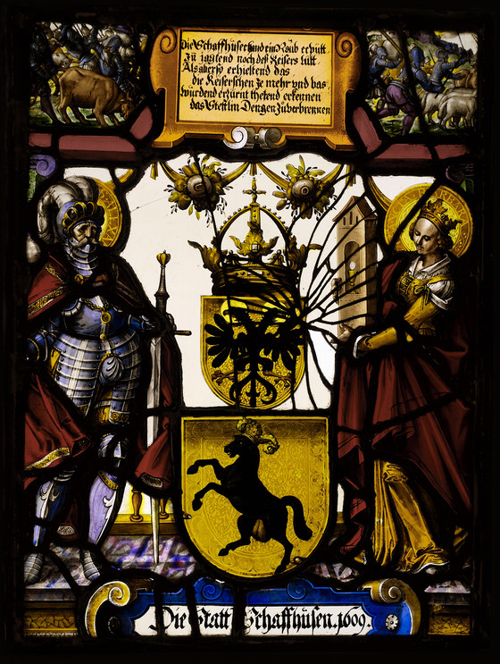 Pot metal; white glass with silver stain and enamel; flashed and abraded glass