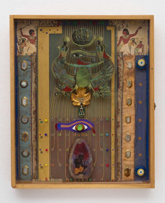Essence of Egypt reflects not only Saar’s longstanding interest in the art and artifacts of many—especially non-western—cultures but also the “Tutmania” that resulted from the first exhibition, in 1972 at the British Museum, of the “Treasures of Tutankhamun,” considered the first “blockbuster” and still the most popular show in the British Museum’s history (with 1.7 million visitors). The show subsequently traveled to LACMA in 1978, where it attracted almost one million visitors. The top central portion of this assemblage—with the oval three-figure relief, the so-called Eye of Horus below, and the pale green scarab with falcon wings—is taken directly from a pectoral in the “Treasures of Tutankhamun” exhibition. There are numerous other Egyptian motifs in Essence of Egypt, including images borrowed directly from New Kingdom tomb wall paintings at the top left and right.