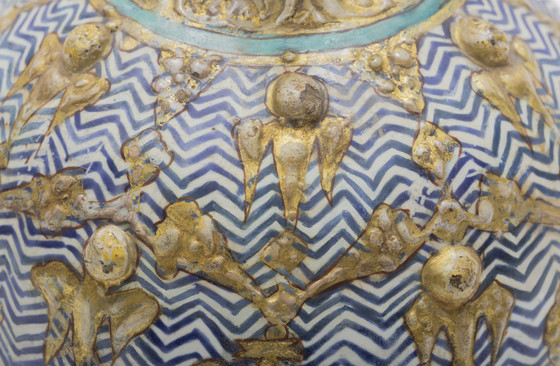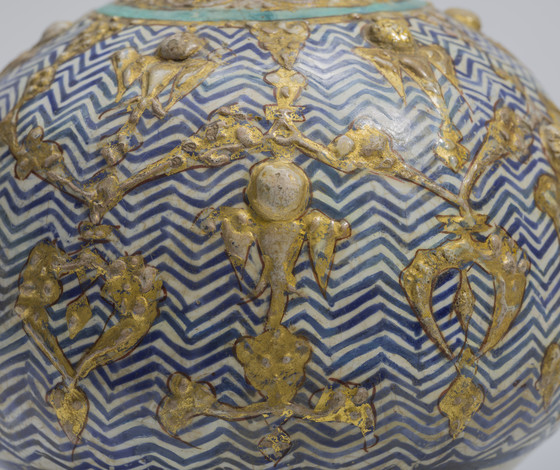 Fritware, inglaze- and overglaze-painted and gilt (mina'i)