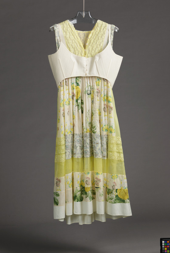 a) Dress: Cotton plain weave (voile), printed, cotton plain weave (organdy), and cotton lace, pieced, with cotton embroidery, shell buttons, and silk grosgrain trim; b) Corset: Cotton sateen, quilted, with cotton twill tape, shell buttons, metal D-rings, and silk satin ribbon