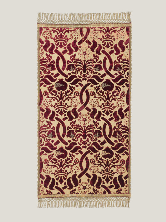 Silk cut and metallic uncut velvet on silk satin ground with silk- and metallic-thread passementerie and knotted fringe