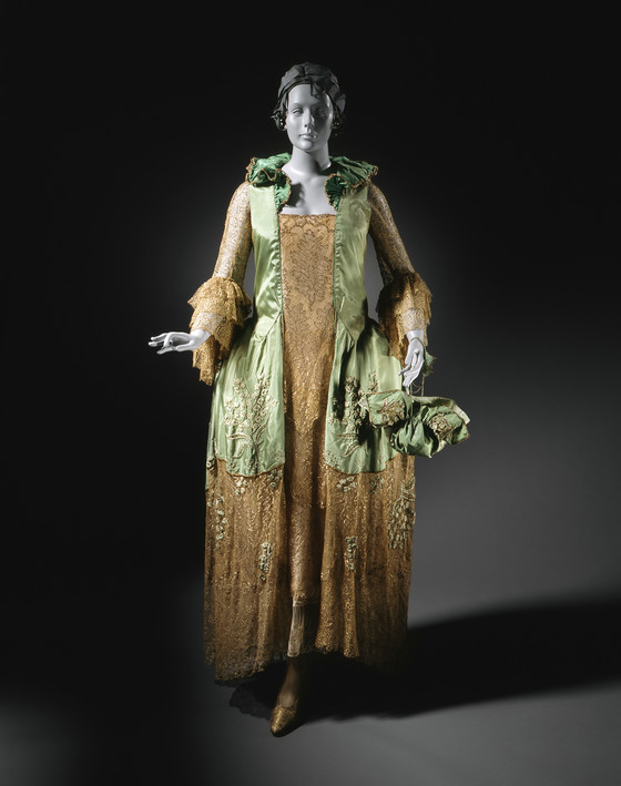 Dress: silk plain weave (taffeta) with silk and metallic-thread lace, silk plain weave (crepe chiffon), and silk and metallic-thread