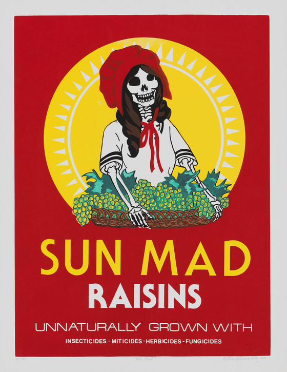 In 1981, Hernández found the answer in a billboard for Sun Maid, a privately-owned cooperative of raisin growers whose large commercial farms dominated the area where she grew up. Sun Maid’s iconic logo, first introduced in 1916, depicts a smiling white farmworker holding a basket overflowing with juicy green grapes. Hernández transformed this edenic image to convey the harsh realities of farmworker life, replacing the original model with a leering skeleton and underscoring her anger with the altered slogan "Sun Mad Raisins, unnaturally grown with insecticides, miticides, herbicides, fungicides." This powerful critique references the work of Mexican printmaker José Guadalupe Posada (1852-1913) who used skeleton figures (sometimes referred to as calaveras) in his dark, satirical images.