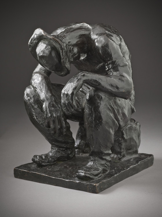 The surface of Tired Out ripples softly throughout, giving an amorphous feeling to the solid mass. Young’s sketchy handling was probably inspired by Rodin. The toiler is dressed in rough, loose, work clothes, his strength conveyed by his oversized hands. Exhausted, and perhaps asleep, his head and shoulders droop down toward his knees. Although at rest, he conveys a power comparable with that of Young’s active laborers, who strain under their physical exertion. Despite its small size, the figure is monumental in conception.