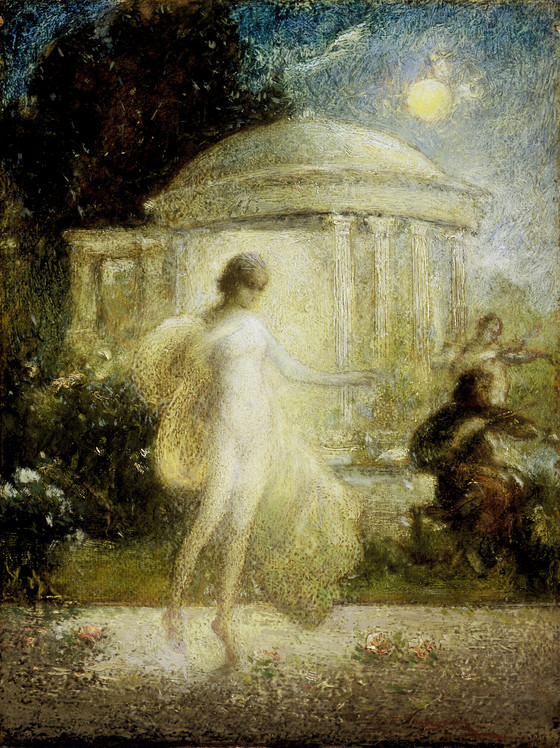 As in the artist’s The Moon Path, 1910-15 (private collection), a ghostly nude figure dances on a pool of moonlit water. Like the nude figures that recline on the ledges in some of Daingerfield’s Grand Canyon paintings, this dancer is symbolic, in this case of the quality and poetry of moonlight. An early champion of Ryder, Daingerfield was a symbolist painter who evoked concepts and feelings through his imaginary subjects. As Ryder and Blakelock tried to do, Daingerfield sought, in The Temple Dancer, to achieve richly colored, enamellike surfaces by the extensive use of glazes.