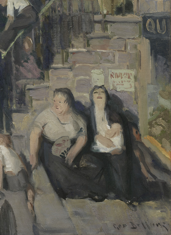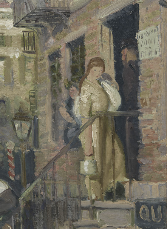 One cannot find in Cliff Dwellers any trace of a change in tone from Bellows’s other urban scenes, whose subject and spirit center on the excitement and bustling activity of the city and the surging vitality of its lower classes. The spirit of the scene is established by the innocent joie de vivre of the brightly lighted foreground group of young women and children, especially the bawling, grinning, brawling boys so familiar in Bellows’s works. Another prominent note is the mother ascending the stairs on the far right, so reminiscent of the hard-working homemakers of Daumier and Chardin. On the far left, the bright colors of a market cart attract the eye. Except for the large building in deep shadow, the effect is that of sunshine, with a stiff breeze lifting some of the laundry. The irregular angles of the streets and the streetcar’s "Vesey Street" destination sign suggest that this is a location in the Lower East Side of Manhattan between the Bowery and Catherine Slip below Chatam Square.
