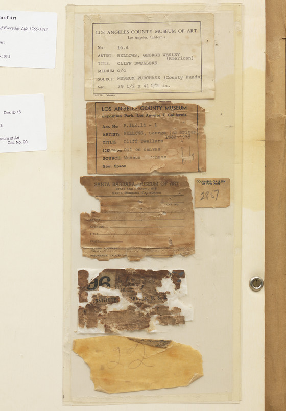 The record book reveals that Cliff Dwellers was organized according to a disciplined color scheme, primarily based on the ideas of the color theorist and paint supplier Hardesty G. Maratta (1864-1924), which were of much interest to Bellows, Robert Henri, and others in the 1910s. The painting’s palette is indicated as: Three c[h]ords.