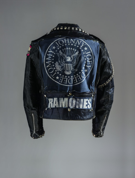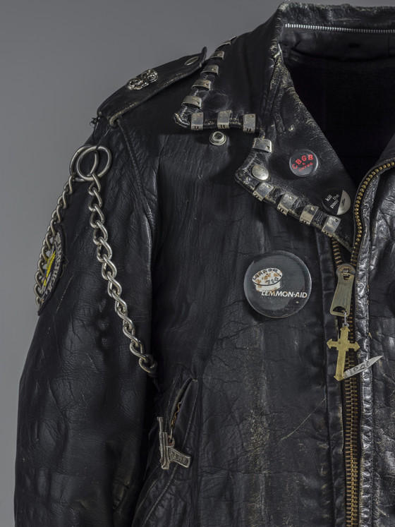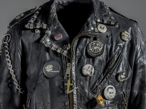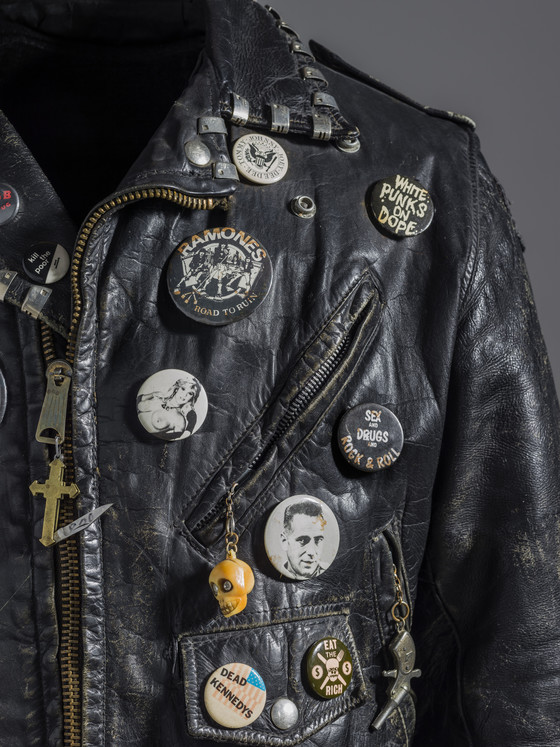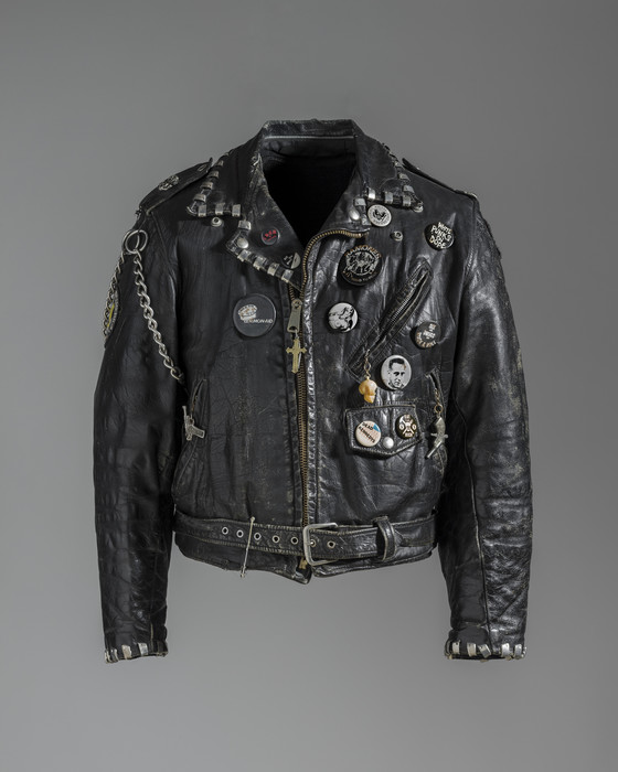 Leather, metal, plastic, cotton knit, and machine-embroidered patches