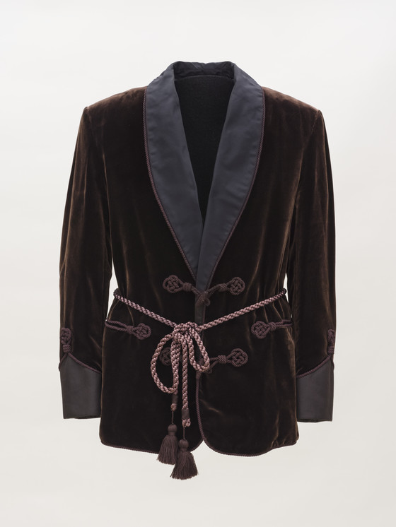 Silk velvet and polyester plain weave with cotton cord trim and silk cord belt with wool tassels
