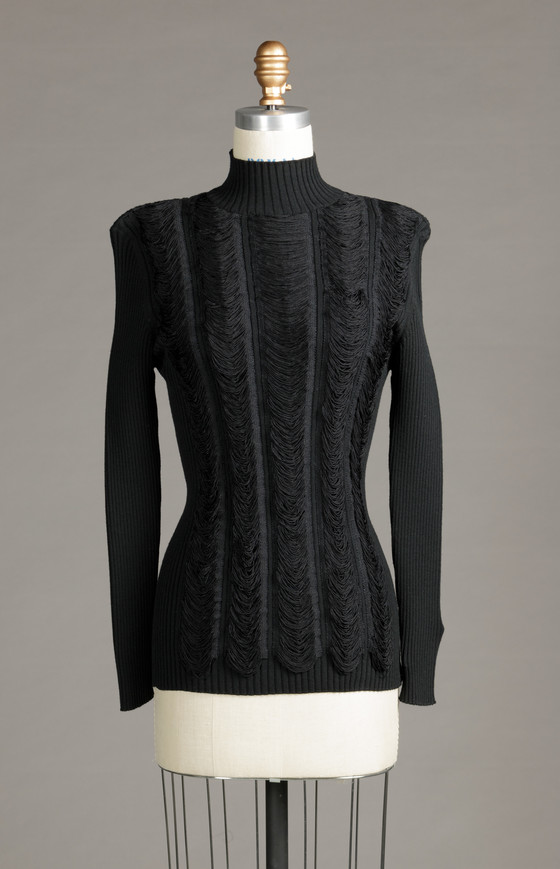 Sweater: wool knit with silk fringe; Skirt: rayon/silk figured weave with supplementary weft patterning