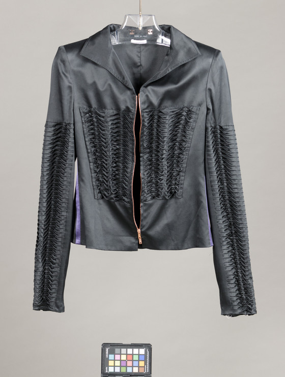 Jacket: silk/spandex/cotton satin. Pants: cotton/spandex satin