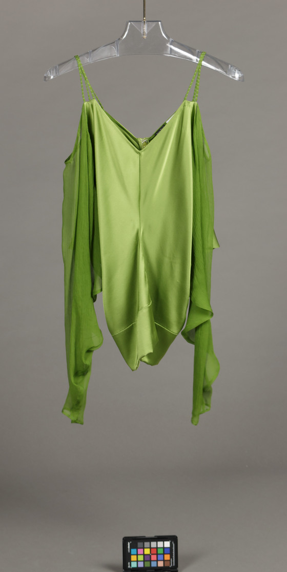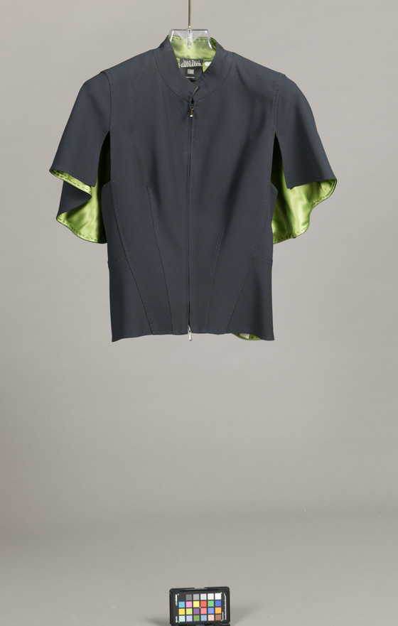 Jacket: wool and rayon plain weave; Blouse: silk plain weave and silk chiffon