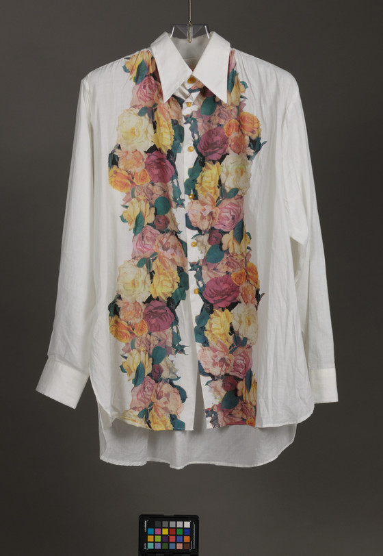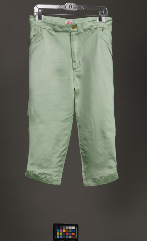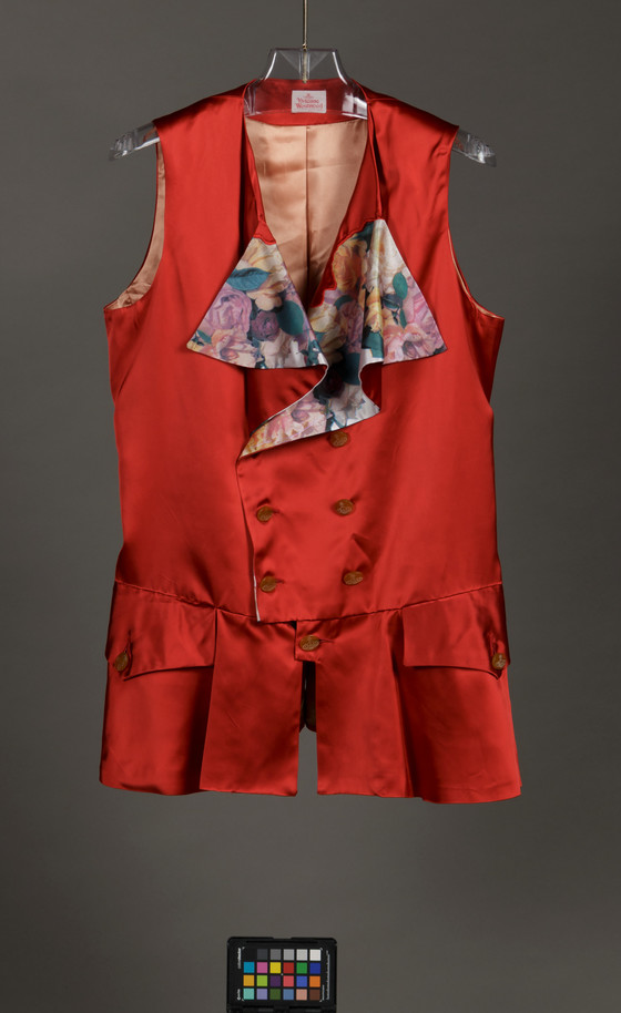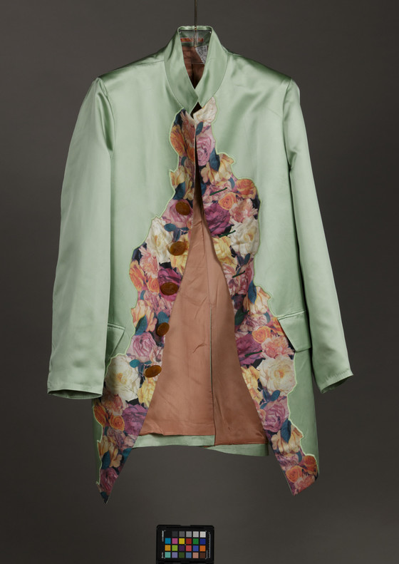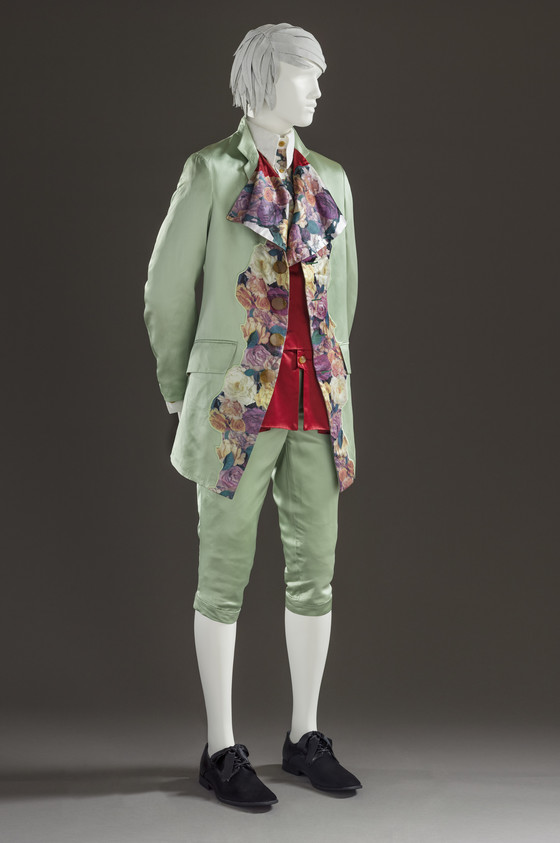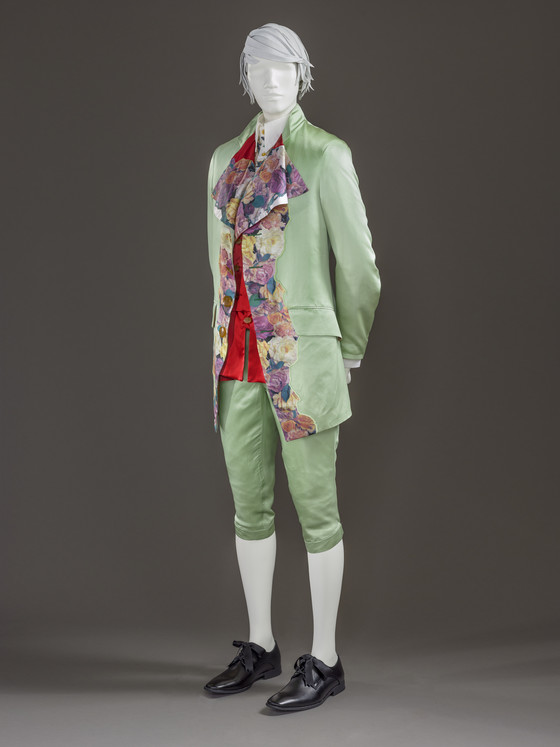 Jacket and Waistcoat: acetate satin, printed; Breeches: acetate satin; Shirt: cotton plain weave, printed
