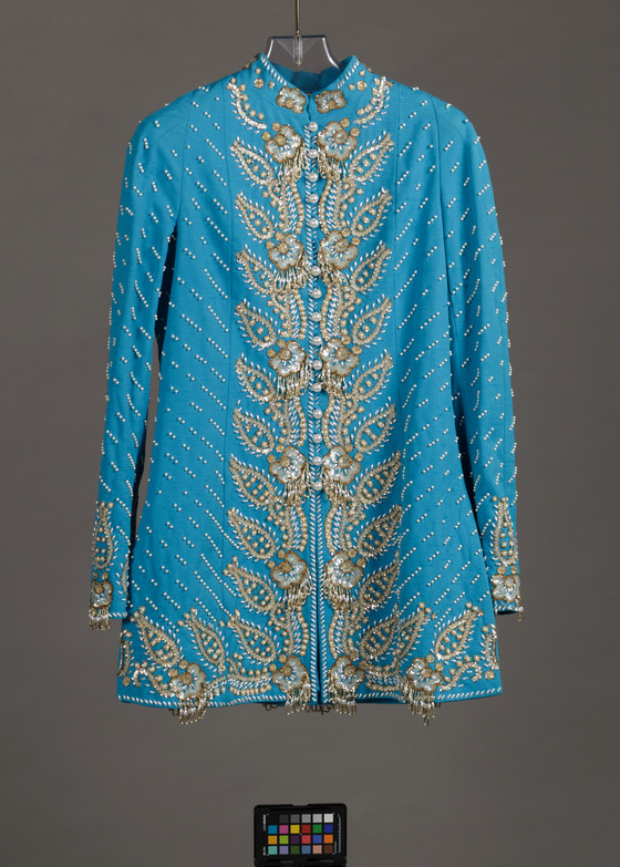 Cotton/silk plain weave (faille) with embroidery of sequins, glass beads, and faux pearls.