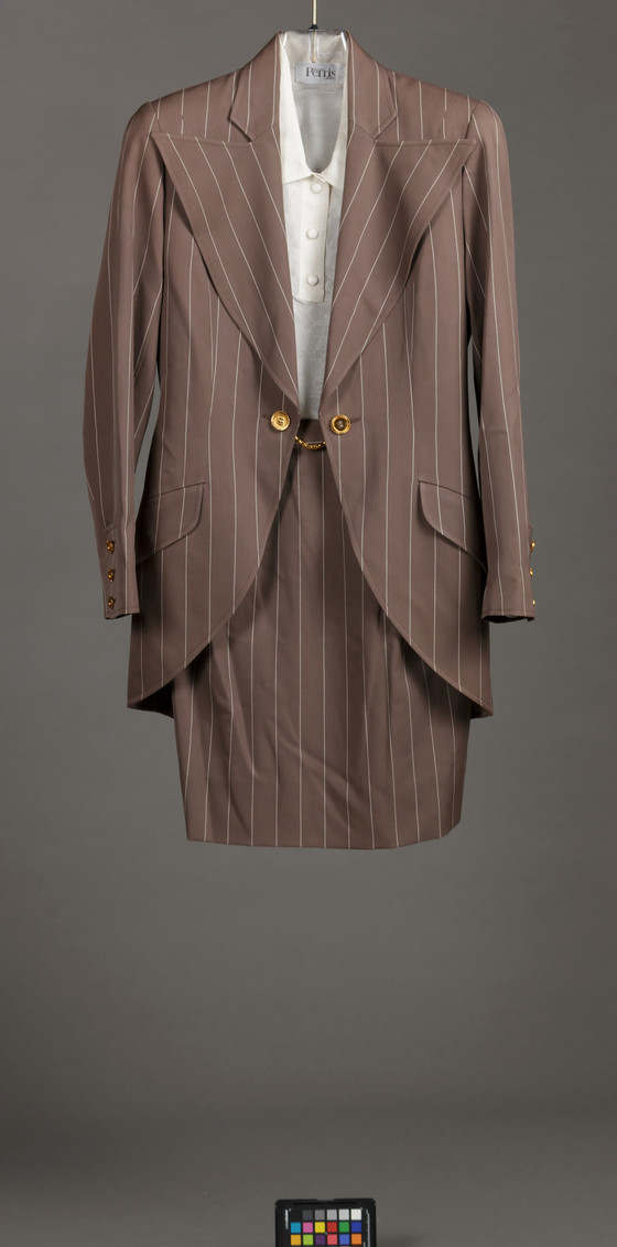 Cape, Jacket, and Skirt: wool twill; Blouse: silk plain weave with supplementary warp patterning; Button chain: metal