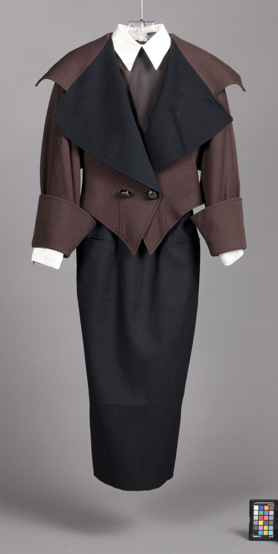 Jacket and Skirt: cashmere twill, fulled; Blouse: silk plain weave; Collar: silk satin