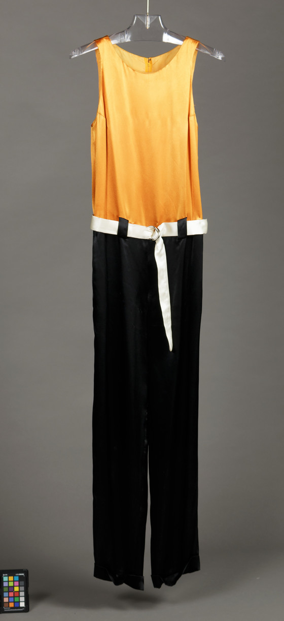 Jumpsuit: rayon satin; Belt: rayon satin and metal