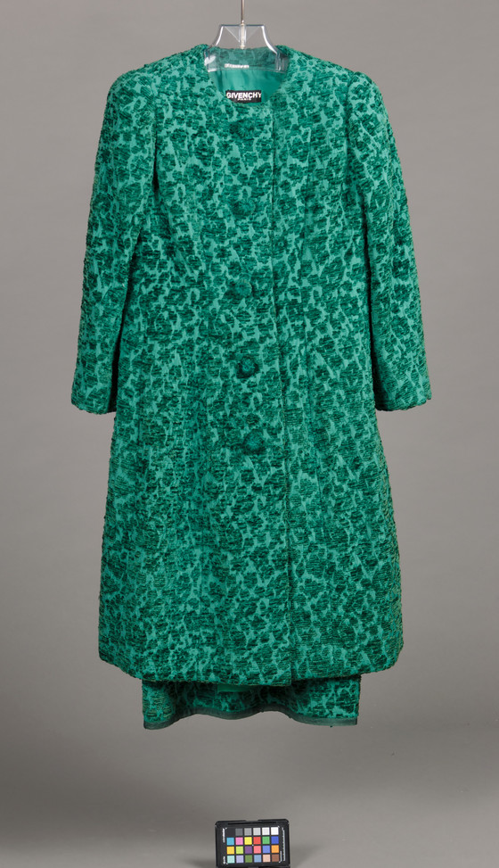 Coat: Silk plain weave with supplementary silk chenille weft patterning, chenille silk covered buttons