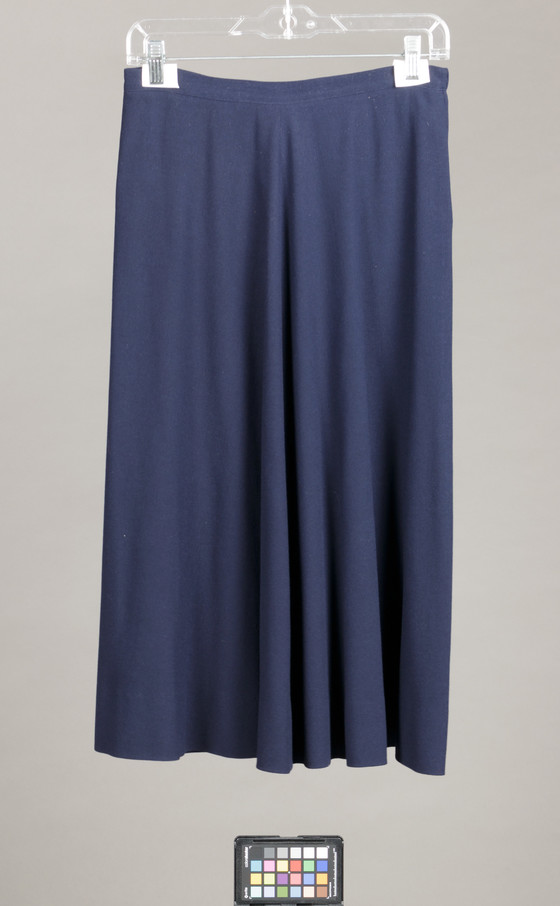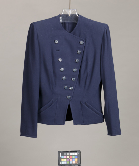 Jacket: wool plain weave (crepe) with plastic buttons; Skirt: wool plain weave (crepe); Belt: wool plain weave (crepe) with metal