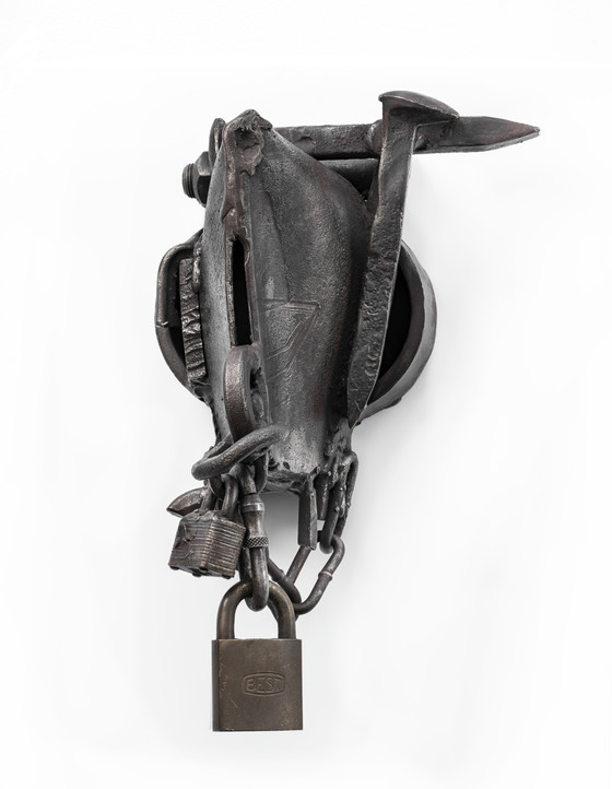 The Lynch Fragments helped to establish Edwards as a sculptor and to lay out the formal language he would continue in his practice. Edwards returned to the series through his activism related to the Vietnam War, and as a result of his connections to Africa and the African diaspora following the first of many sustained visits to Africa in the 1970s. The wall-bound welded steel forms evoke chains, locks, handcuffs, and farming equipment. The weld marks and the roughness of the metal surfaces, subjected to protruding blunt and sometimes sharp forms, convey an unequivocal sense of violence and danger. Edwards prescribes the hanging height of the Lynch Fragments to align with the artist’s eye level; roughly the size of a human head, sculptures such as Go confront the viewer face to face. Reflecting on the dynamics of hanging and suspension associated with both lynching and how large steel sculptures are formed, the Lynch Fragment series would lead to larger-scale works and a number of public commissions.