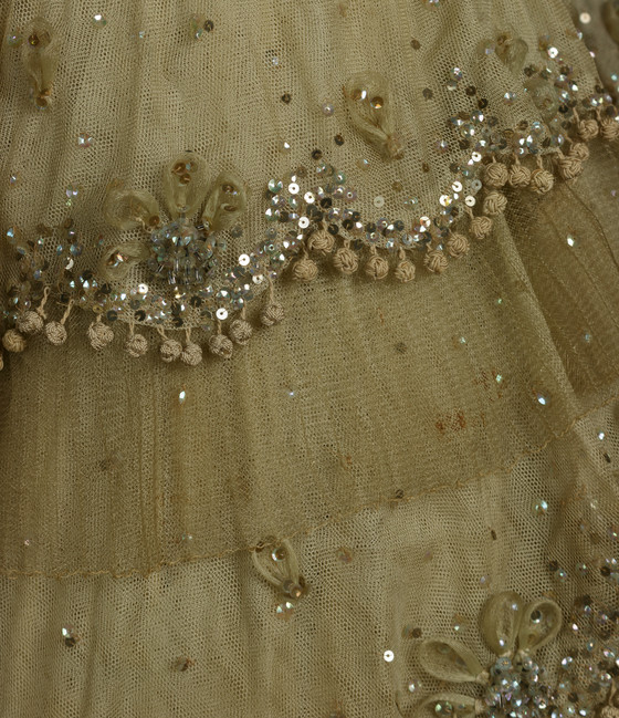 Silk net with horsehair braid, silk satin, silk knotted passementerie, plastic sequins, metal sequins, and glass beads