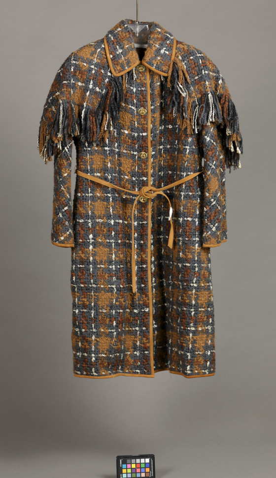 Coat: wool twill (boucle) with suede leather and metal fasteners; Belt: suede leather