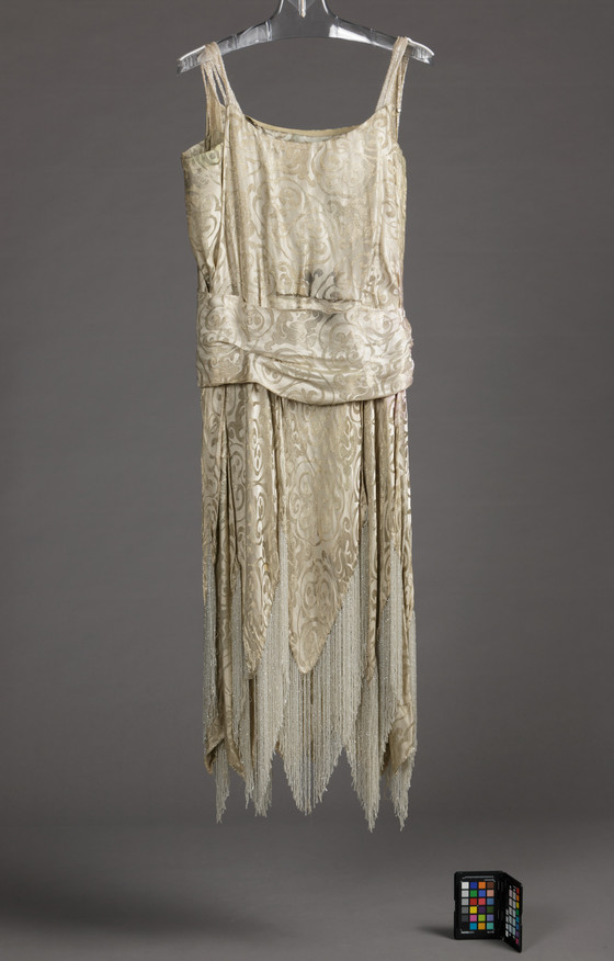 Silk satin with metallic-thread supplementary-weft patterning and glass beads