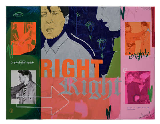 Acrylic, oil stick, graphite, oil pastel, archival pigment prints on three canvases in a high polished aluminum frame