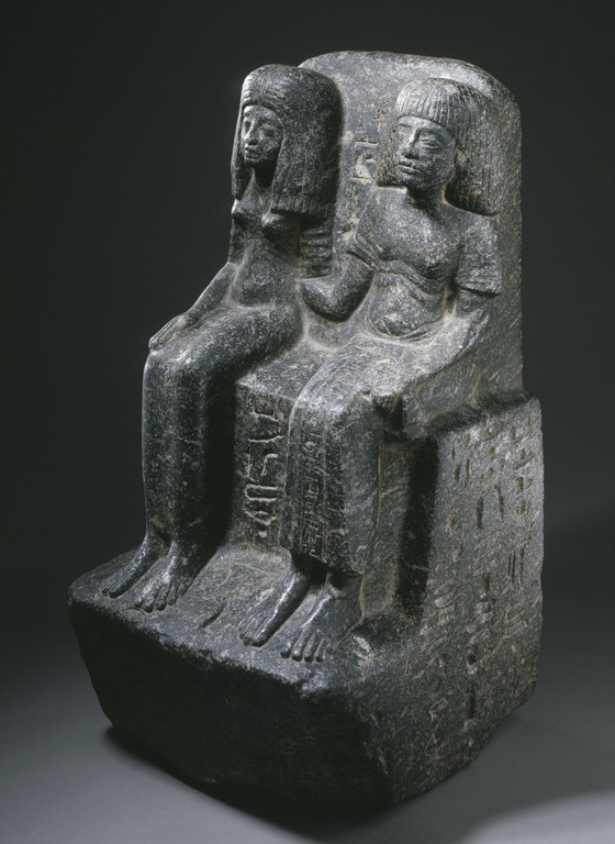 This statue of a seated couple, Userhat, King's scribe and overseer of the granaries at Thebes (modern day Luxor), and his wife, Kha, are identified by the hieroglyphic text inscribed on their laps. An inscription on the front of Userhat's kilt describes him as "Royal Scribe of the Granary." The elegant garments and the naturalistic rendering of Userhat's torso suggest a late 18th or early 19th dynasty date. In a gesture of affection, the outline of Kha's hand appears wrapped around Userhat's left arm. The inscription on the statue also expresses their wish to take part in "everything which comes forth from upon the offering table fo Amun of the City [Thebes]...