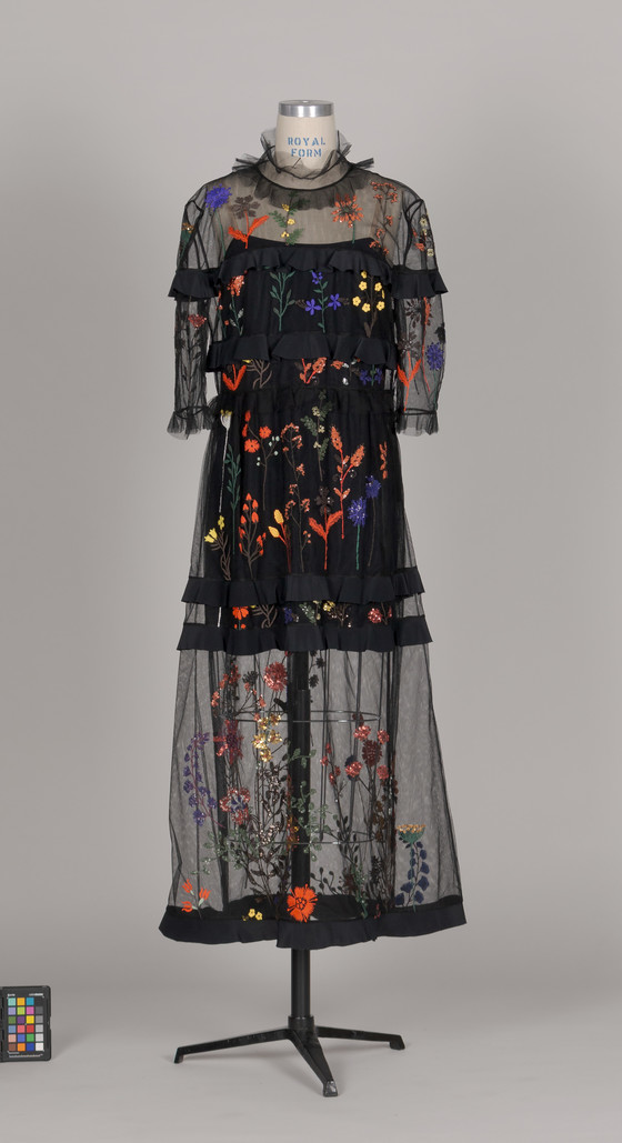 Dress: Silk net, polyester plain weave (faille) with cotton embroidery and plastic sequins; Slip: Polyester/elastane knit; Bag: Cotton plush with leather and metal