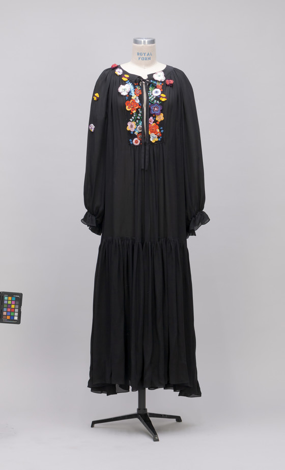 a) Rayon twill weave and polyester, nylon ,and elastane knit, with cotton and plastic embroidery and appliqués, and glass beads; b) Silk plain weave (crepe) with polyester, cotton and plastic embroidery and appliqués, and glass beads; c) Leather with cotton embroidery, leather appliqués, and metal