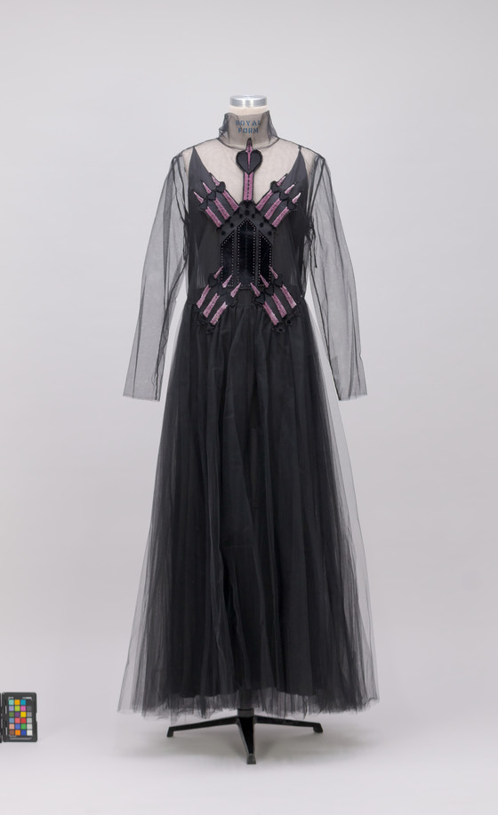Dress: Silk net with silk cut, uncut, and voided velvet appliqué, and silk and elastic plain weave (crepe); Slip: Silk plain weave; Compact: Metal and enameled metal with crystals
