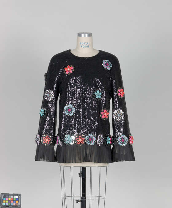 Polyester plain weave with plastic sequins and plastic, synthetic foam, crystal, plastic pearl, and glass bead appliqués