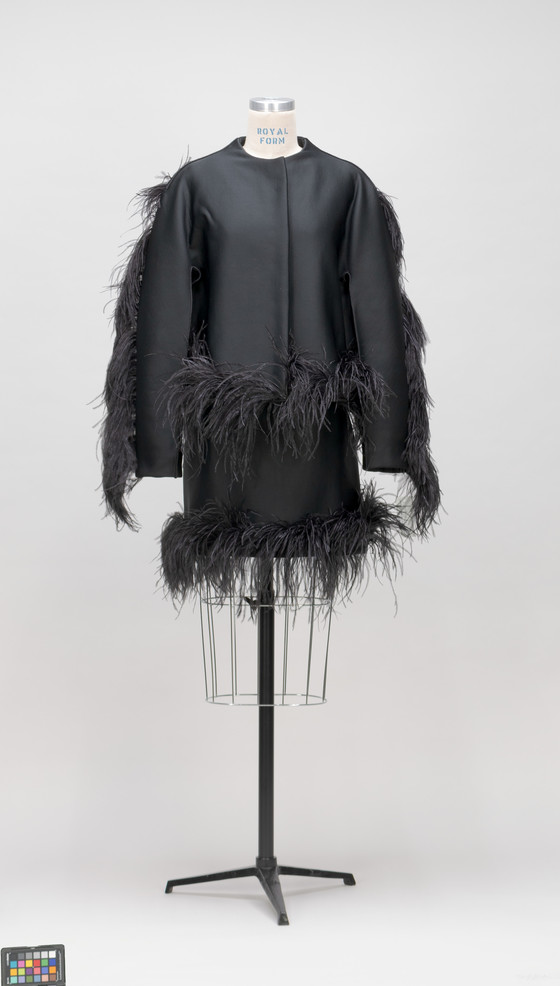 a-b) Wool/polyester/polyamide/elastane knit (neoprene) with ostrich feather trim; c) Silk satin, quilted with crystal closure, silk grosgrain ribbon, and metal chain with ostrich feather trim
