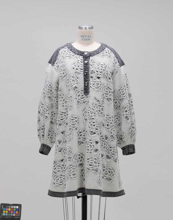 a) Polyurethane; b) Paper/cotton/polyamide and metallic/polyester double jacquard knit and cotton twill weave (denim) with metal buttons; c-d) Polyurethane and cotton plain weave (faille); e) Cotton plain weave (canvas), vinyl coated and printed, with leather, metal chain, and metal zipper; f) Polyurethane, metal, and leather