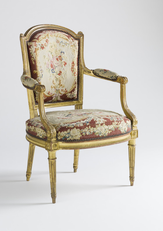 Giltwood, wool tapestry
