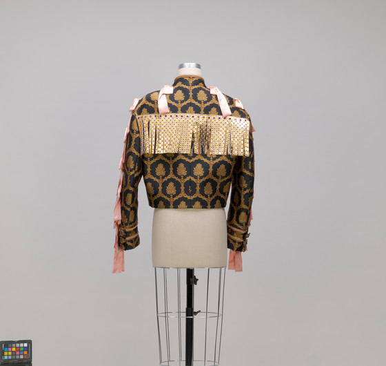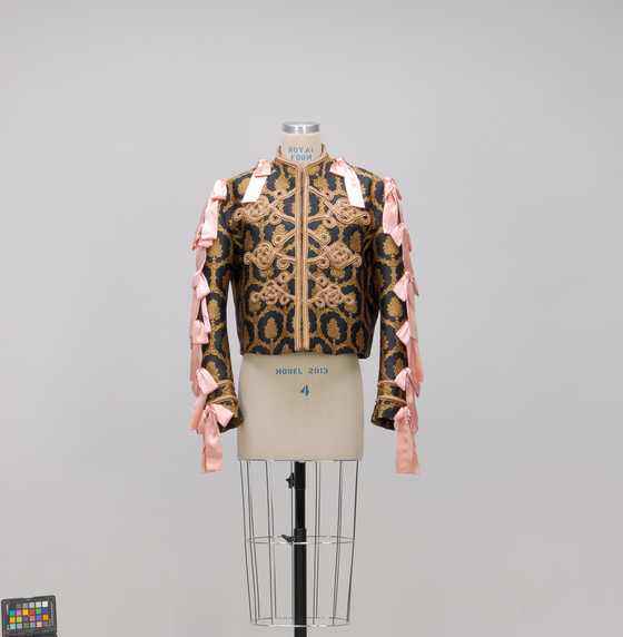 Polyester, acrylic, silk, and wool twill weave with supplementary-weft pattering bound in twill with metallic thread braid and silk satin trim