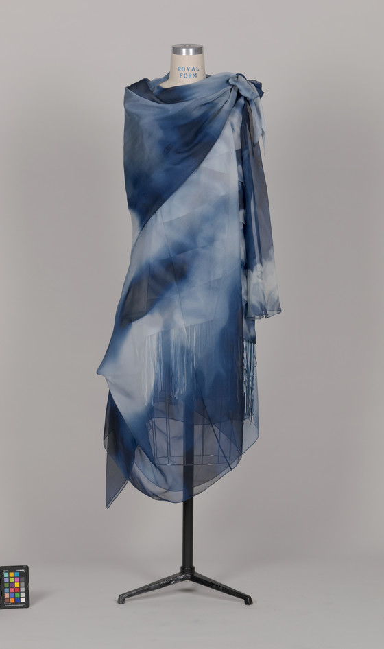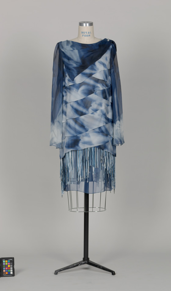 Dress: Silk plain weave printed with silk fringe; Cape: Silk plain weave printed