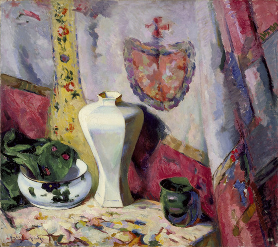 During the 1910s Breckenridge often worked closely with Arthur B. Carles (1880-1952), and the two even used the same objects in their still-life compositions. Both artists shared pictorial concerns and a debt to the fauve palette of Matisse. When The Altar Cloth is compared with Carles’s still-life paintings of this period an essential difference arises: no matter how bold Breckenridge is with his palette, he remains more conservative than Carles in his treatment of form. In The Altar Cloth Breckenridge did not completely relinquish traditional modeling and shading, while in his paintings Carles boldly flattened and simplified his objects. Breckenridge’s modernism at this stage of his development was allied to his use of nonreferential, expressionist color. Indeed, years later Carles acknowledged Breckenridge as the one who taught him about color resonance. It was the color of GEORGE INNESS that first attracted Breckenridge to painting in the 1880s, and color was always to dominate in his more avant-garde works.