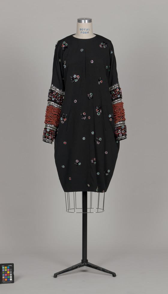 Silk plain weave (crepe) with crystals and plastic sequins